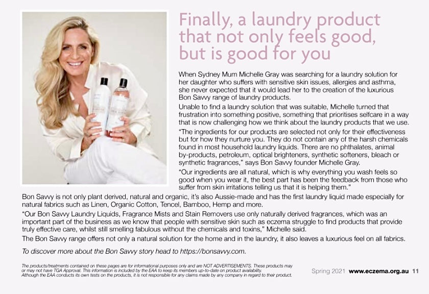 With almost a million people suffering from Atopic Eczema in Australia every year, more and more are realising that laundry detergents, laundry softeners and fragrance are often the hidden culprit behind their skin issues, using Bon Savvy they don't have to worry.