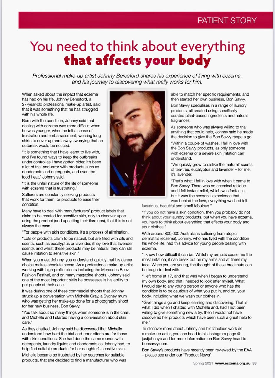 Even one of our wonderful customers, Professional Make up Artist Johnny, a life long sufferer of Eczema had this to say about Bon Savvy, in an interview with the Australia Eczema Association: